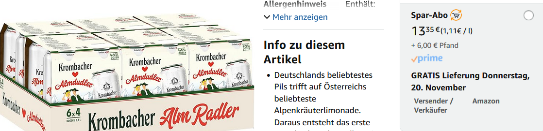 Proooost! Bei Amazon gibt es im Sparabo gerade das 24er Tray Krombacher AlmRadler, 0,5 L für 13,35€ inkl. Versand. Ohne Prime kommen wie üblich noch Versandkosten hinzu. Das Radler hat einen Alkoholgehalt von 2% Vol.