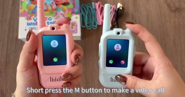 Die Video-Walkie-Talkies für Kinder als 2er-Pack kombinieren Kamera, Bildschirm und Sprach-/Videoanrufe für gemeinsames Spielen drinnen und draußen. Laut Text bieten sie ein Secure-Pairing, bis zu 100 m innen und 300 m außen, USB-C-Akku und ein leichtes, tragbares Design.