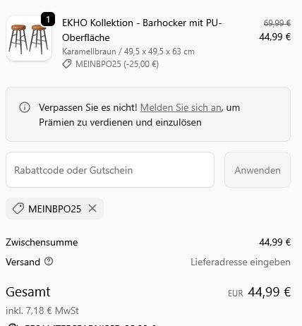 Bei Eingabe des Codes im Warenkorb kommt die Meldung „Gutscheincode MEINBPO25 kann nicht eingelöst werden“. Geht das nur als „Mitglied“? Unabhängig davon ist der reguläre Preis bei 69,99 € (kleinere Sitzhöhe – es gibt zwei Varianten) und somit ergäbe sich abzgl. 25% ein Endpreis in Höhe von 52,49 €.