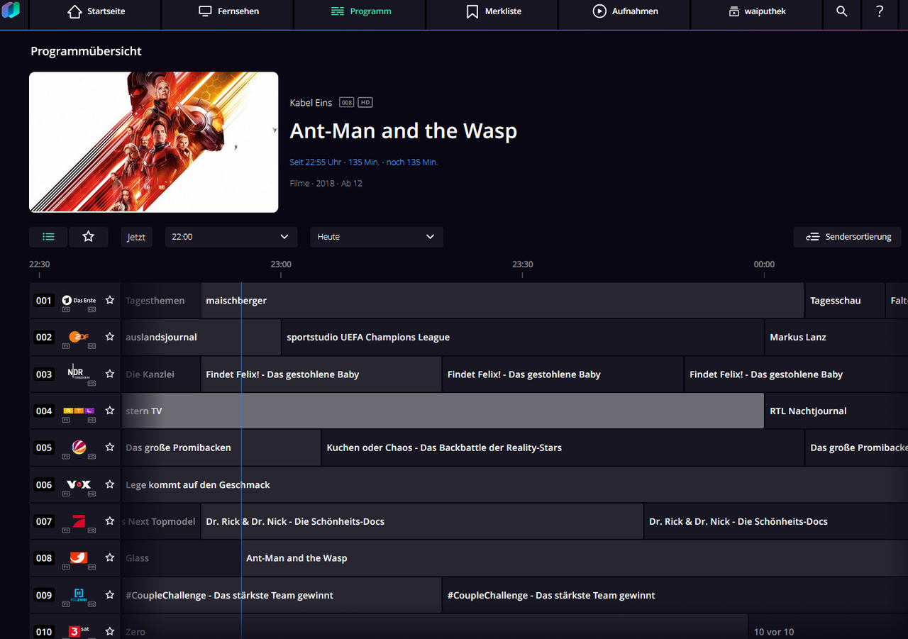 Wie sieht es mit einer ProgrammĂŒbersicht analog der SFI von Technisat aus? Gibt es sowas bei den Waipu-Sendern? Also dass man z. B. in einer Ăbersicht sehen kann, was 20:15 Uhr lĂ€uft.